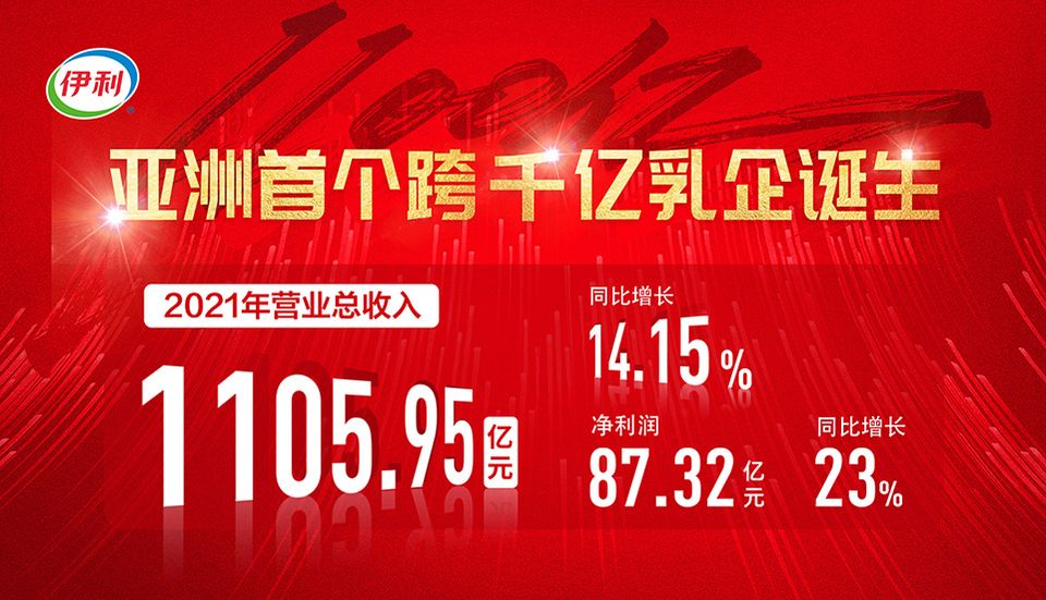 2021年,伊利集團全年實現營業總收入1105.95億元,成為亞洲首個跨千億乳企。