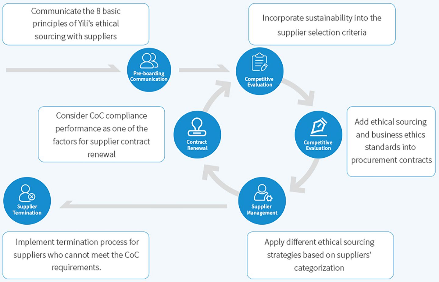 In addition to the 8 basic principles, Yili officially became a member of the Sedex network on 1st November 2023, and issued the "Responsible Procurement Standards " (CoC) in reference to the Sedex Smeta standards. The CoC contains specific requirements for suppliers in terms of environment, health and safety, labor, and business ethics. We implement supplier tiering management where suppliers' sustainability performances are evaluated through questionnaires, on-site audits, and other methods in accordance to our CoC. Based on the evaluation results, suppliers that are not in compliance with our CoC are required to make corrective actions. In order to better integrate ethic sourcing requirements into our daily supplier management, we have also upgraded our supplier management procedures. This ensures that the CoC is reflected in our supplier lifecycle management, including but not limited to:
