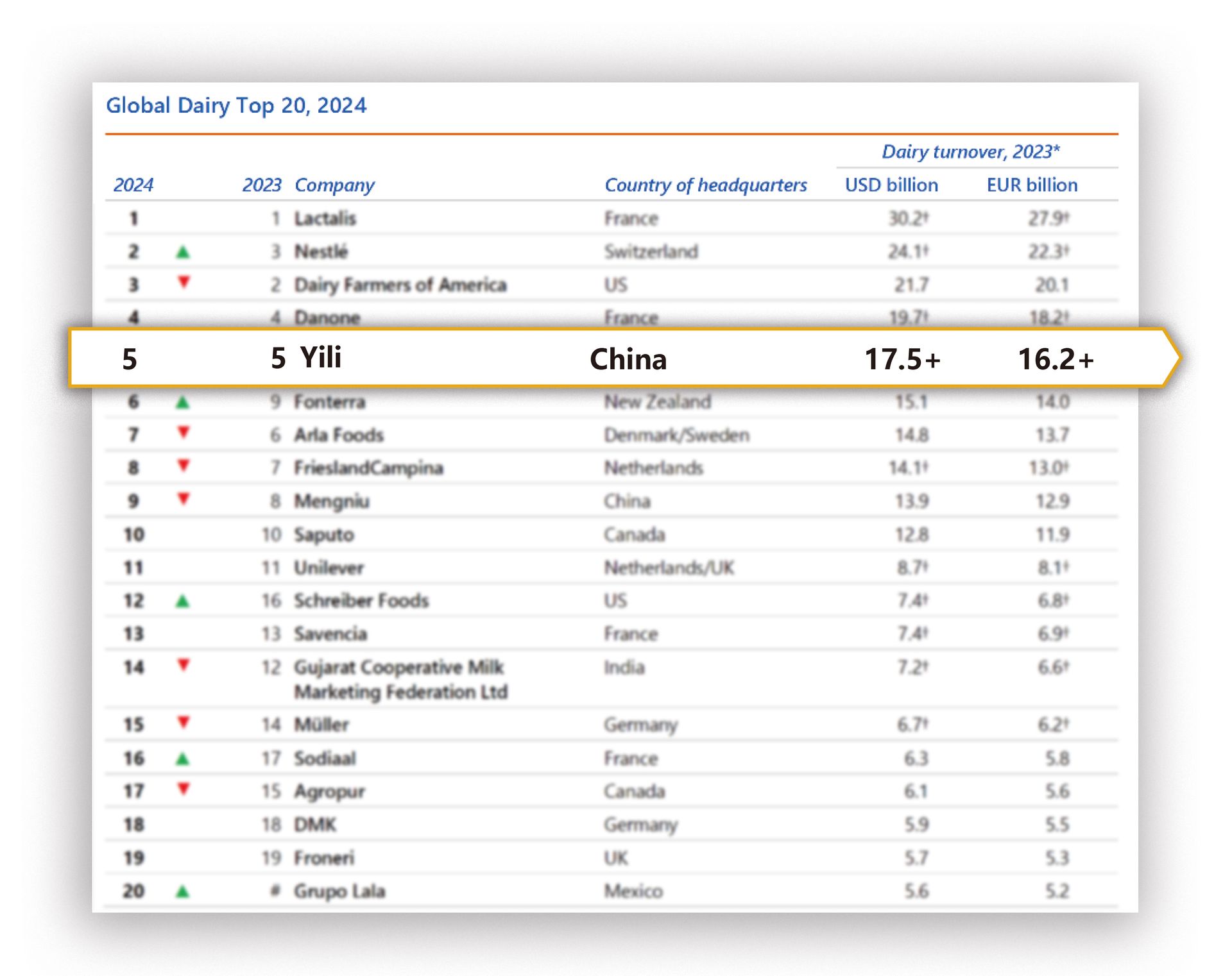 伊利穩居全球乳業五強、連續11年蟬聯亞洲乳業第一