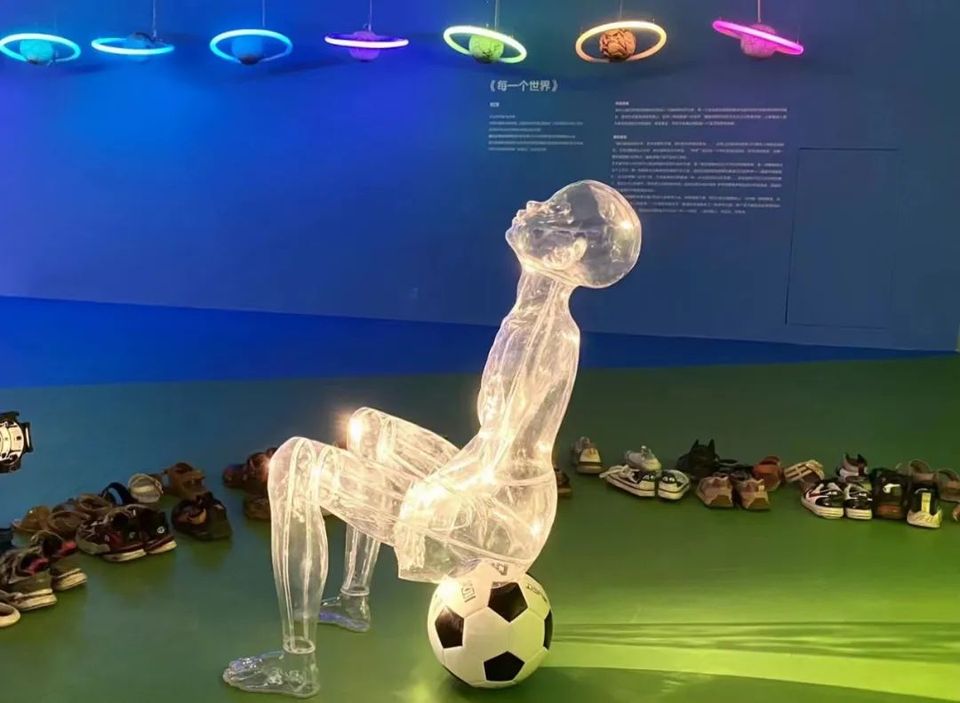 雕塑藝術(shù)家、中國雕塑家協(xié)會會員劉寶亮作品的關(guān)鍵詞則是“看見”。他為這次展覽創(chuàng)作的作品《若有若無》,主體是一個坐在足球上的透明的少年,周圍散落著從鄉(xiāng)村收集來的,孩子們穿過的破舊球鞋。劉寶亮希望大家能通過孩子透明的身體,看見孩子的未來夢想。