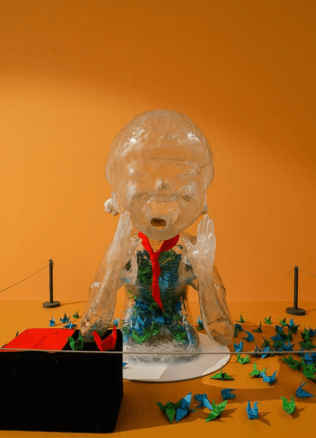世界動畫協(xié)會中國分會成員何文文,用“純粹”來詮釋他的作品。他在透明狀的兒童雕塑中嵌入了來自山里孩子們的上百個愿望的千紙鶴。何文文認(rèn)為,這些孩子的愿望簡單而純粹,希望能通過這件作品將孩子們的愿望傳遞給大眾。